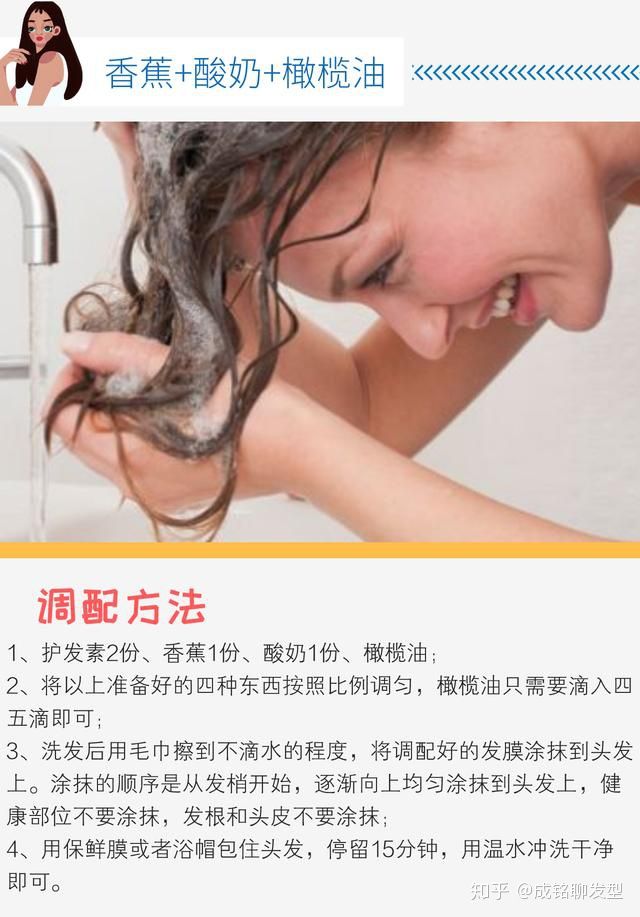 温馨提示:香蕉中含有丰富的维生素,对于受损发质有着非常好的滋润作用。酸奶能够预防开叉和断裂,还能补充头发所需的水分,过期的酸奶效果更好;橄榄油滋润性极强,但用量不能太多,适当加入,做完发膜后头发的亮度提升很多。